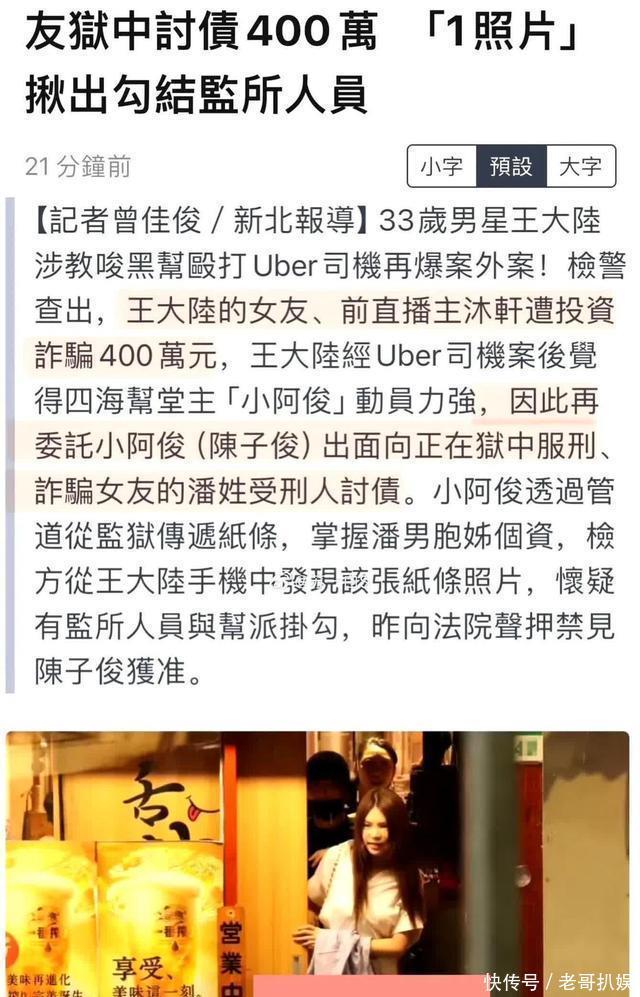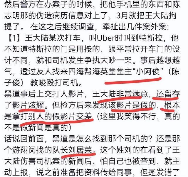 事后越想越气,让游翔闵找了四海帮的人把司机打了。 更魔幻的是,黑帮拿假视频糊弄他,他居然当真了,还保存着到处炫耀,结果成了自己教唆伤人的铁证。 这还不算,王大陆女友之前被人骗了400万,他又找这帮黑帮去监狱威胁诈骗犯,逼着人家从牢里递出姐姐的信息。